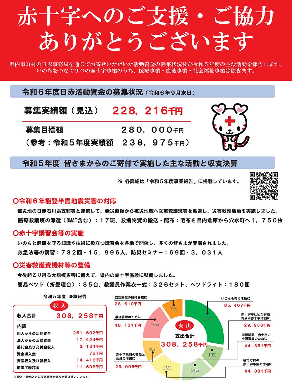 平素より、赤十字活動へのご理解とご協力を賜り、厚く御礼申し上げます。 令和6年度、地区分区を通じてお寄せいただいている活動資金の募集状況 及び令和5年度の主な活動と収支決算を報告します。 以下のチラシをご覧ください。