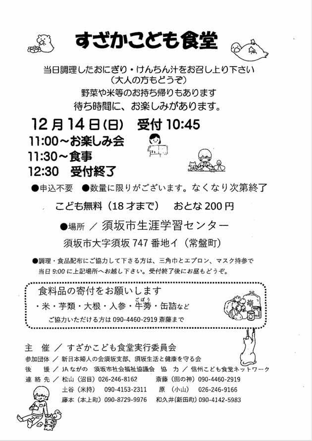 2025年12月14日(日)に子ども食堂が開催されます。 主催は「すざかこども食堂実行委員会」です。 詳細は下記をご覧ください。