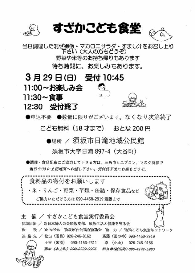 2026年3月29日(日)に子ども食堂が開催されます。 主催は「すざかこども食堂実行委員会」です。 詳細は下記をご覧ください。
