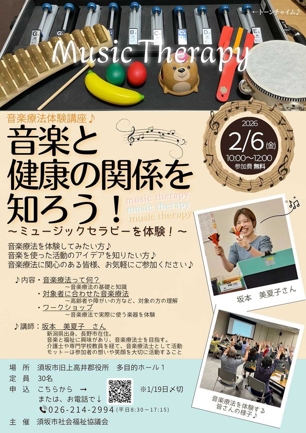 音楽療法を体験してみたい方、音楽を使ったアイデアを知りたい方、音楽療法に関心のある方…!トーンチャイムや音の出る小物なども使ってみんなで楽しめます♪